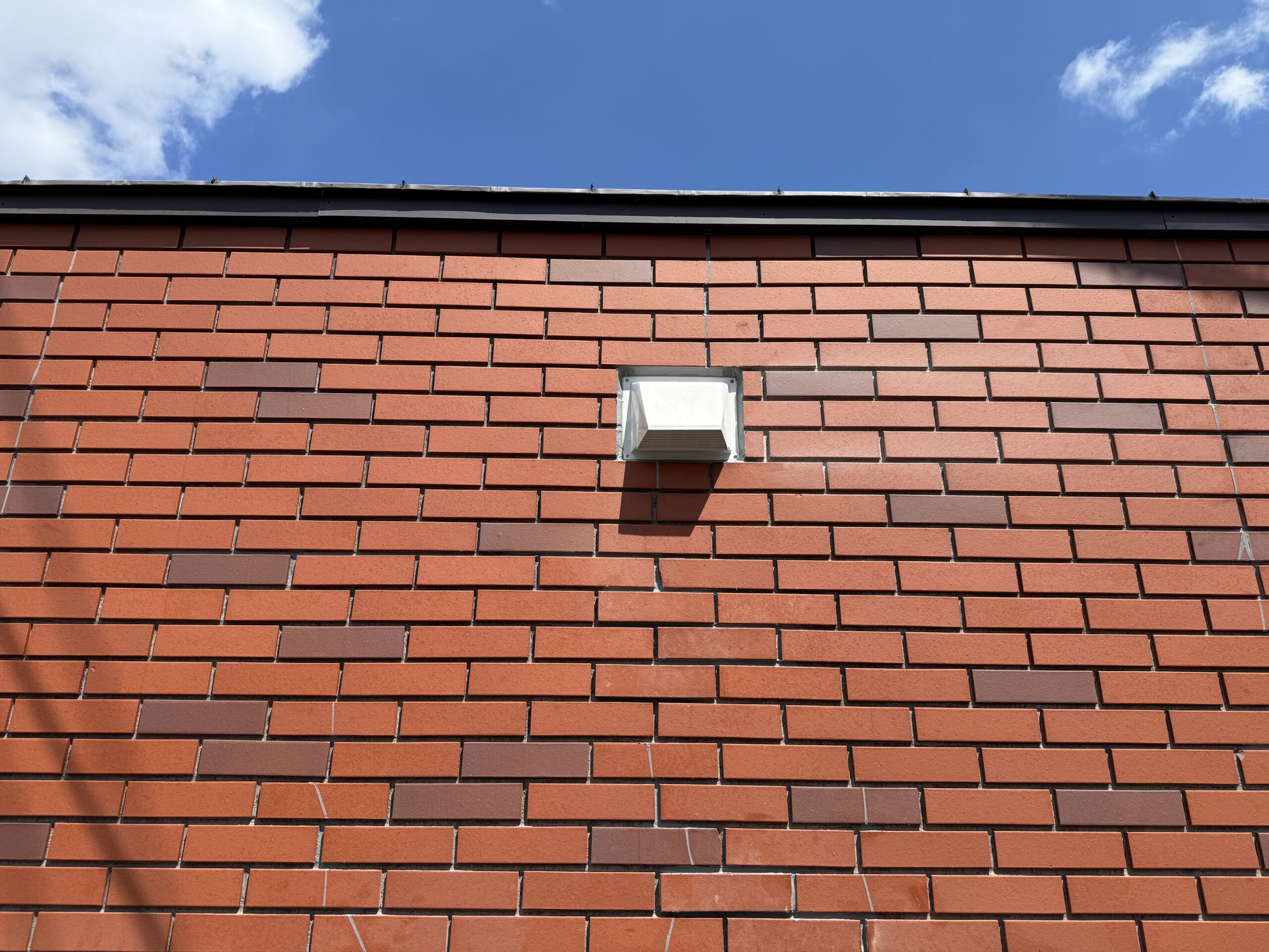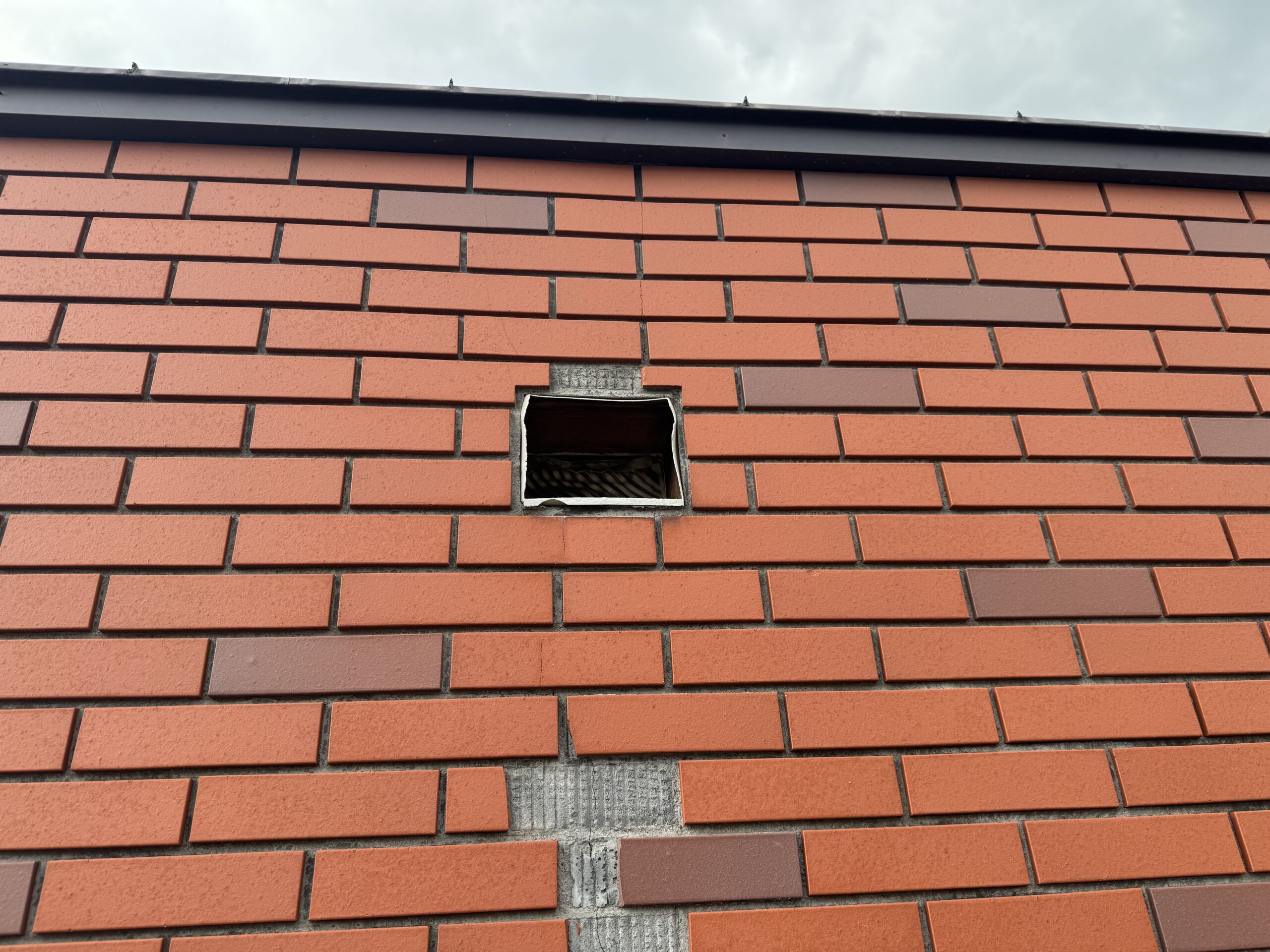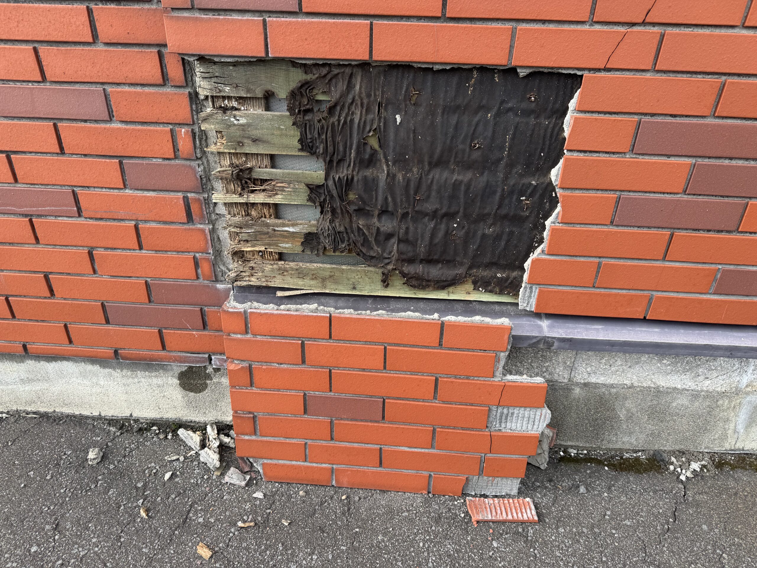 壊れてしまった換気口を新しく取り付け、剥がれているタイル部分は、先に剥がれてしまったタイルを再利用して補修しました。