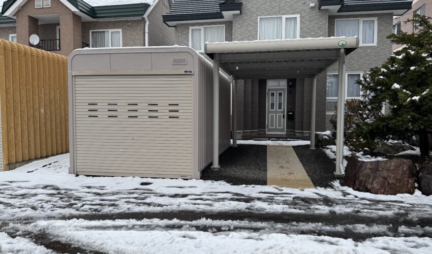 です。ガレージの隣にはスチールのカーポートを設置しました。