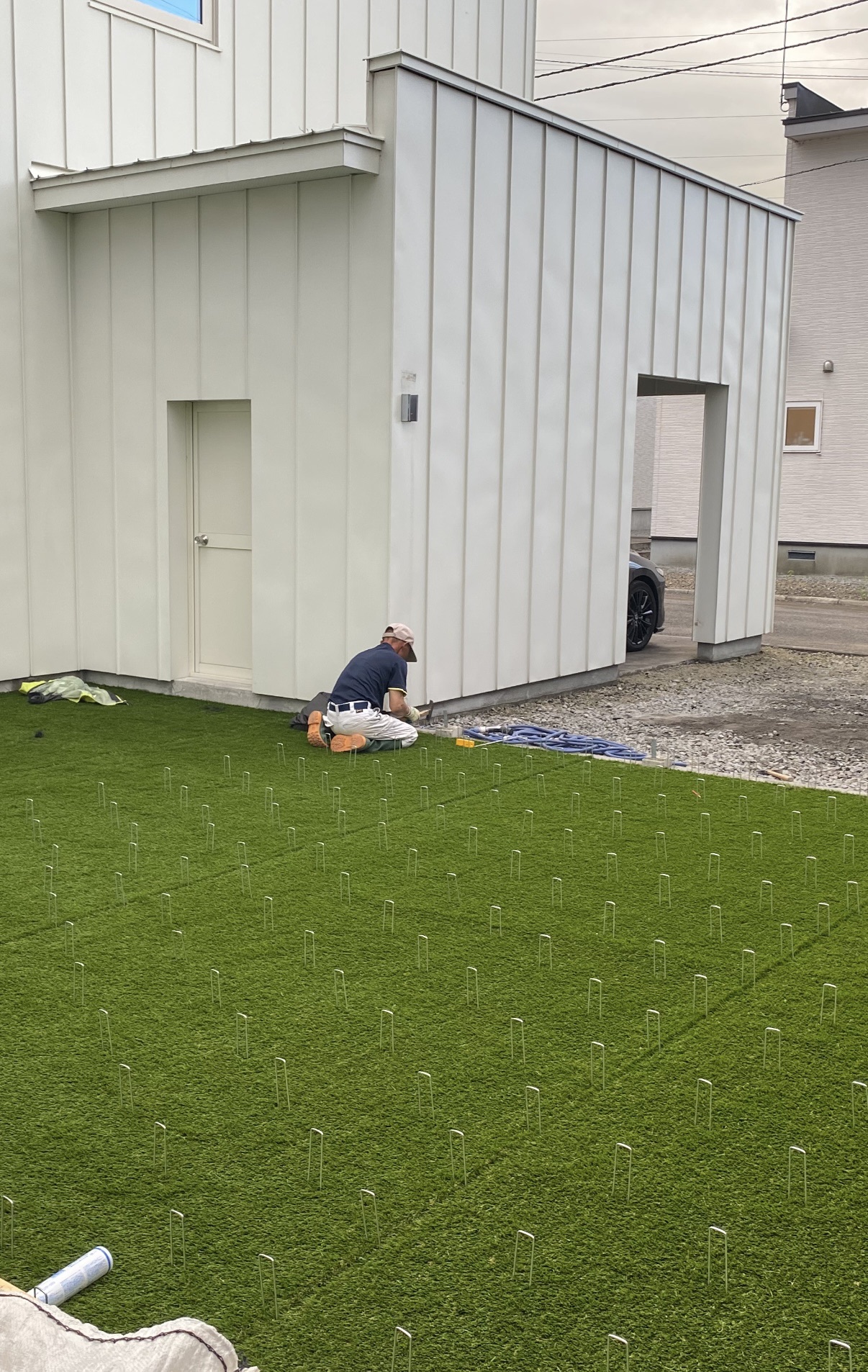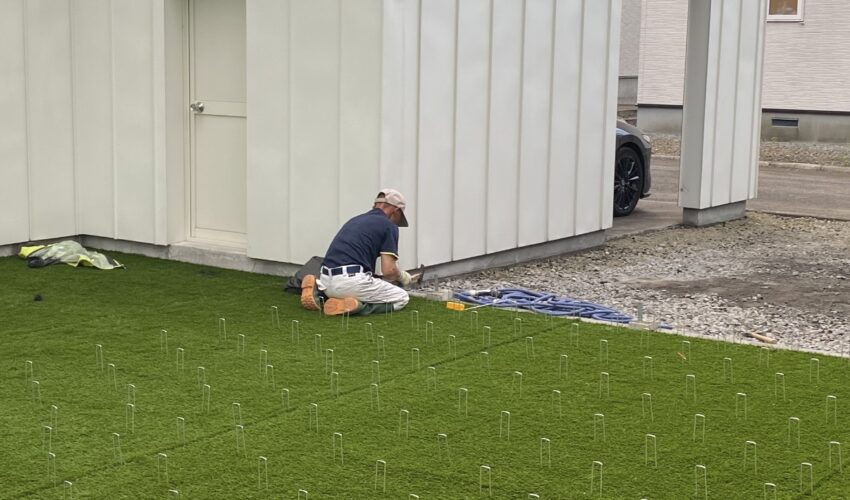 人工芝施工、仕上げのピン打ち作業中です🍀