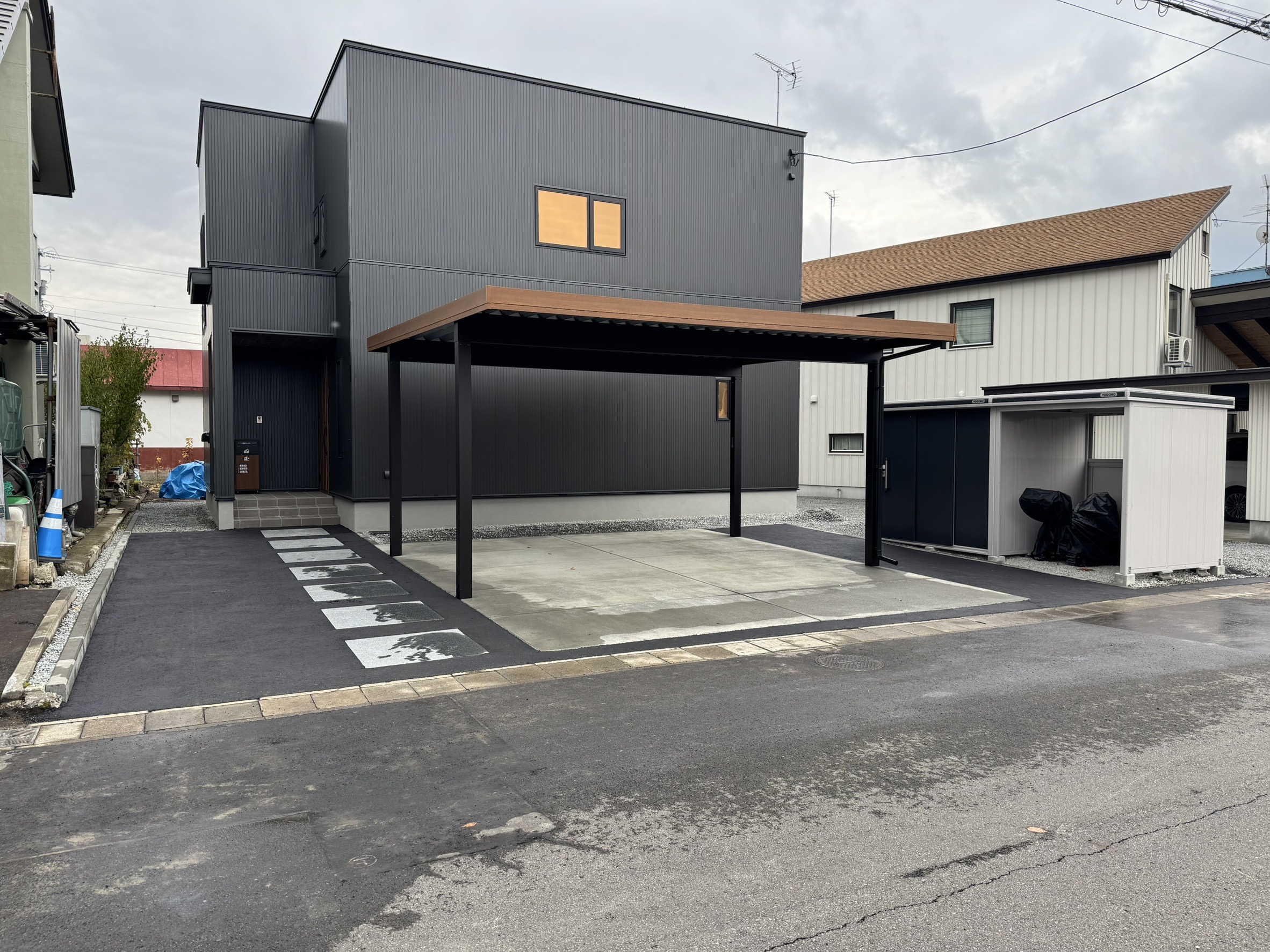 アプローチ:自然石平板□900 色はvグレー 物置:ヨド物置エルモコンビ LMDS-2218+LKDS-1818 色はスミ色 アルミカーポート:2台用 本体色:ブラック 破風:キャラメルチーク カーポート下:土間コンクリート 表面は刷毛引き仕上げで滑りにくくなっています。