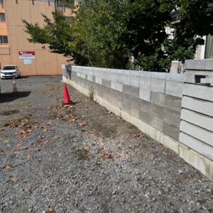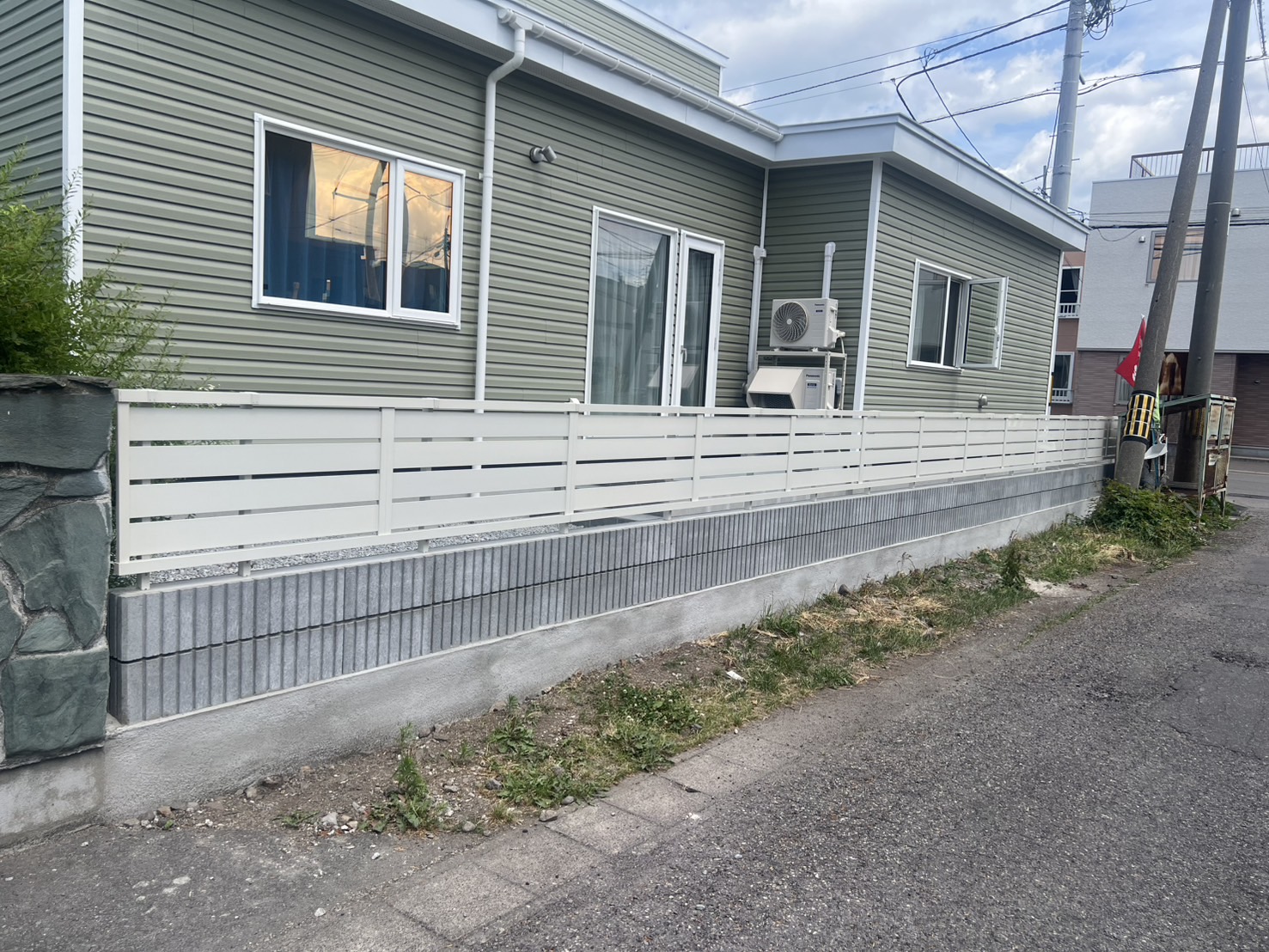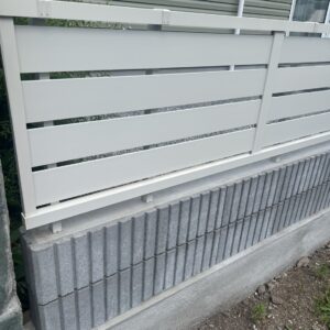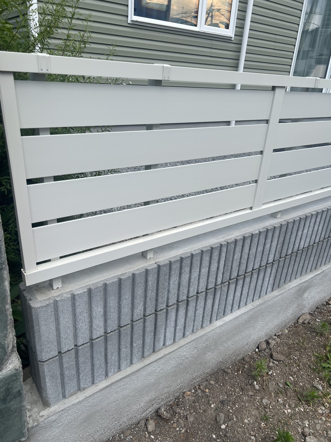 既存の基礎と住宅側のバットレスを左官しごきで綺麗にし、その上によねざわ工業さんのNネオ・リブブロックを2段積み、その上にLIXILさんのフェンスABのYS3型を設置しました!