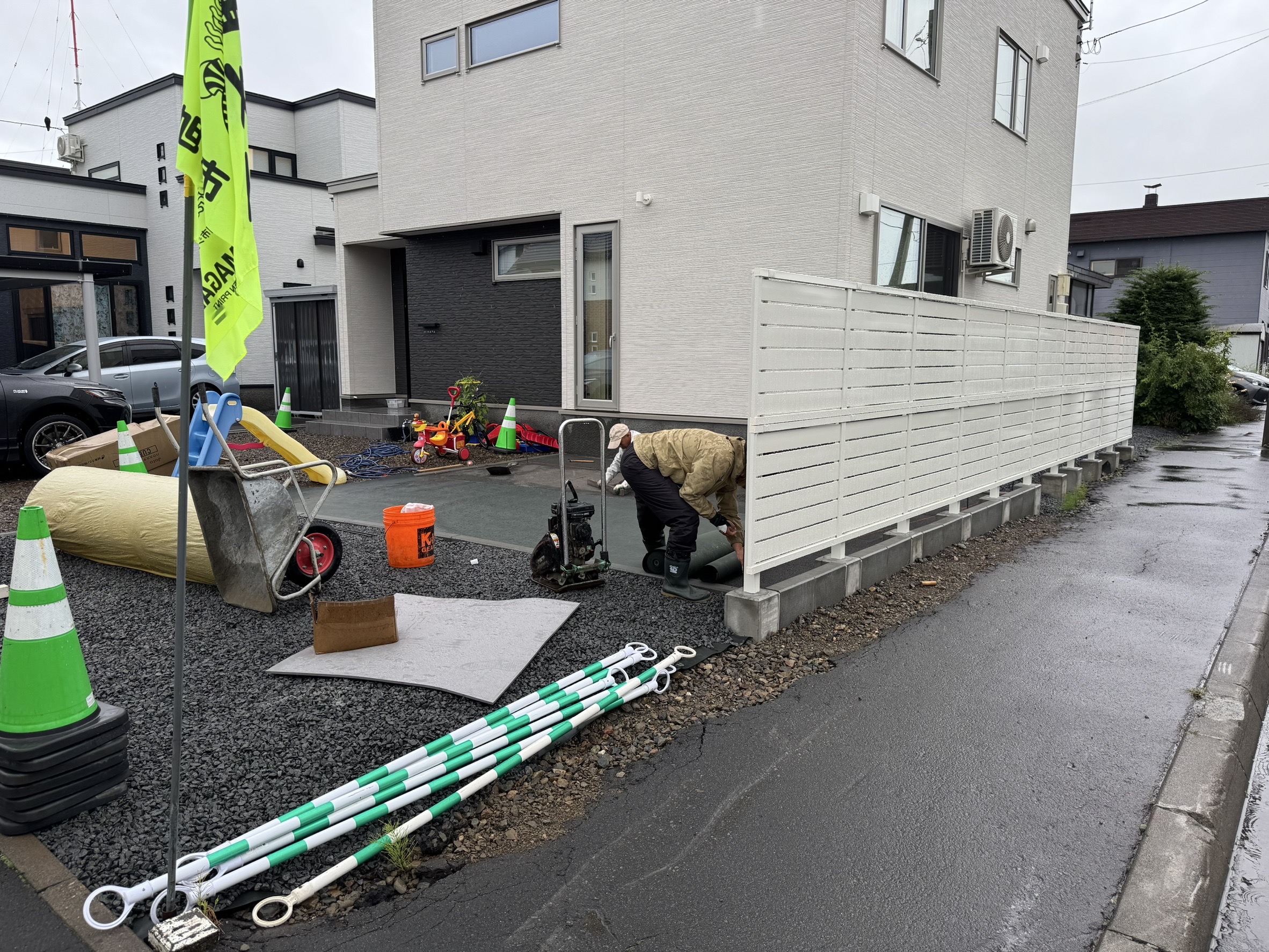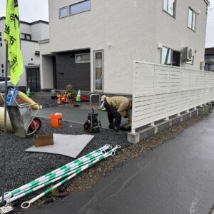 既存の基礎と住宅側のバットレスを左官しごきで綺麗にし、その上によねざわ工業さんのNネオ・リブブロックを2段積み、その上にLIXILさんのフェンスABのYS3型を設置しました!